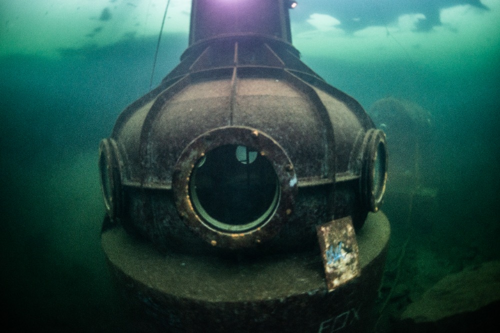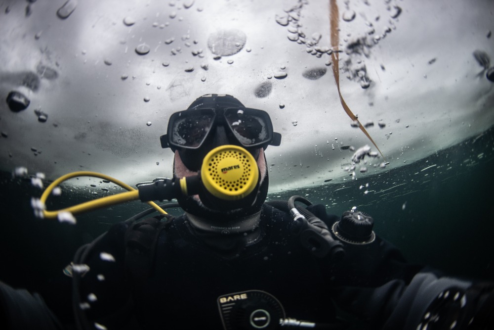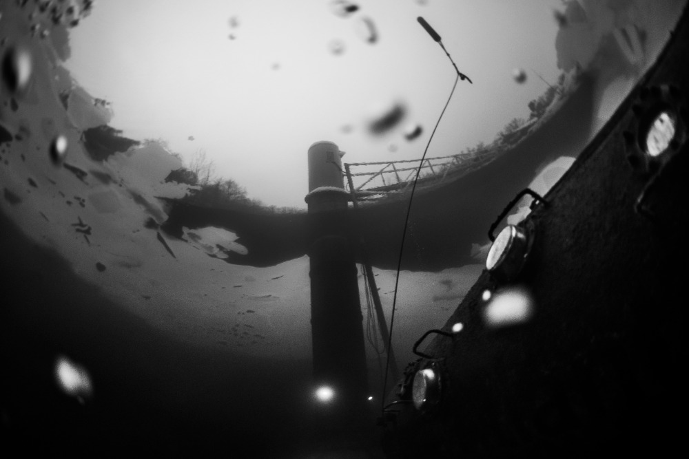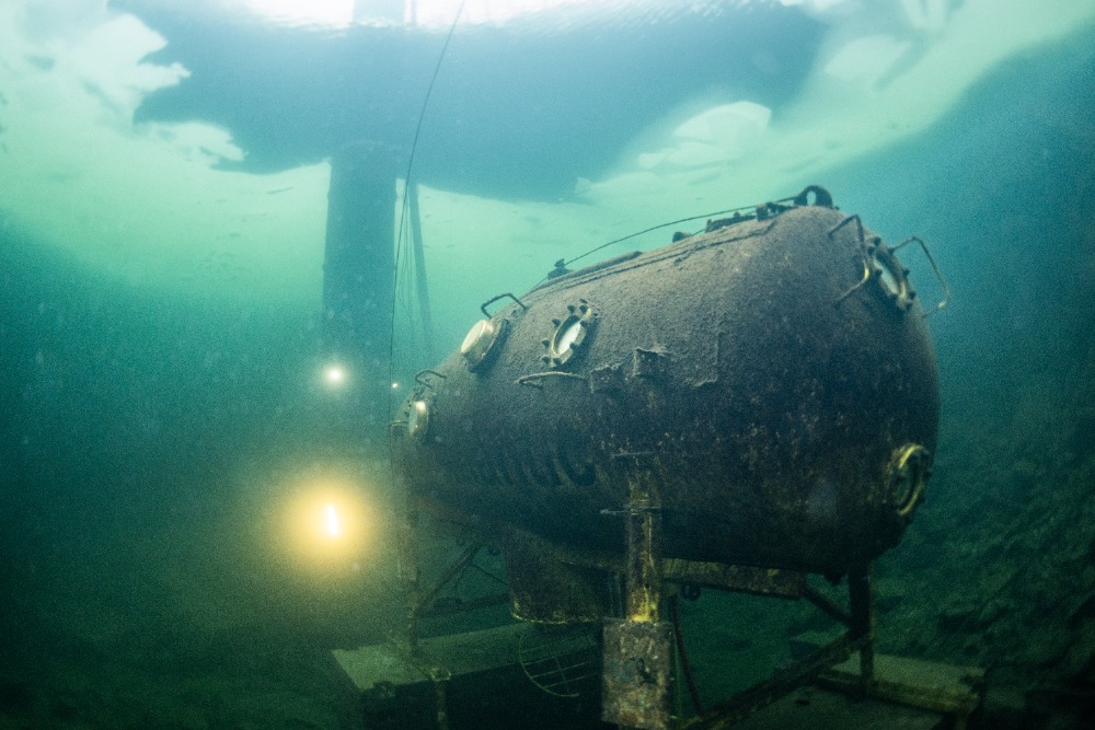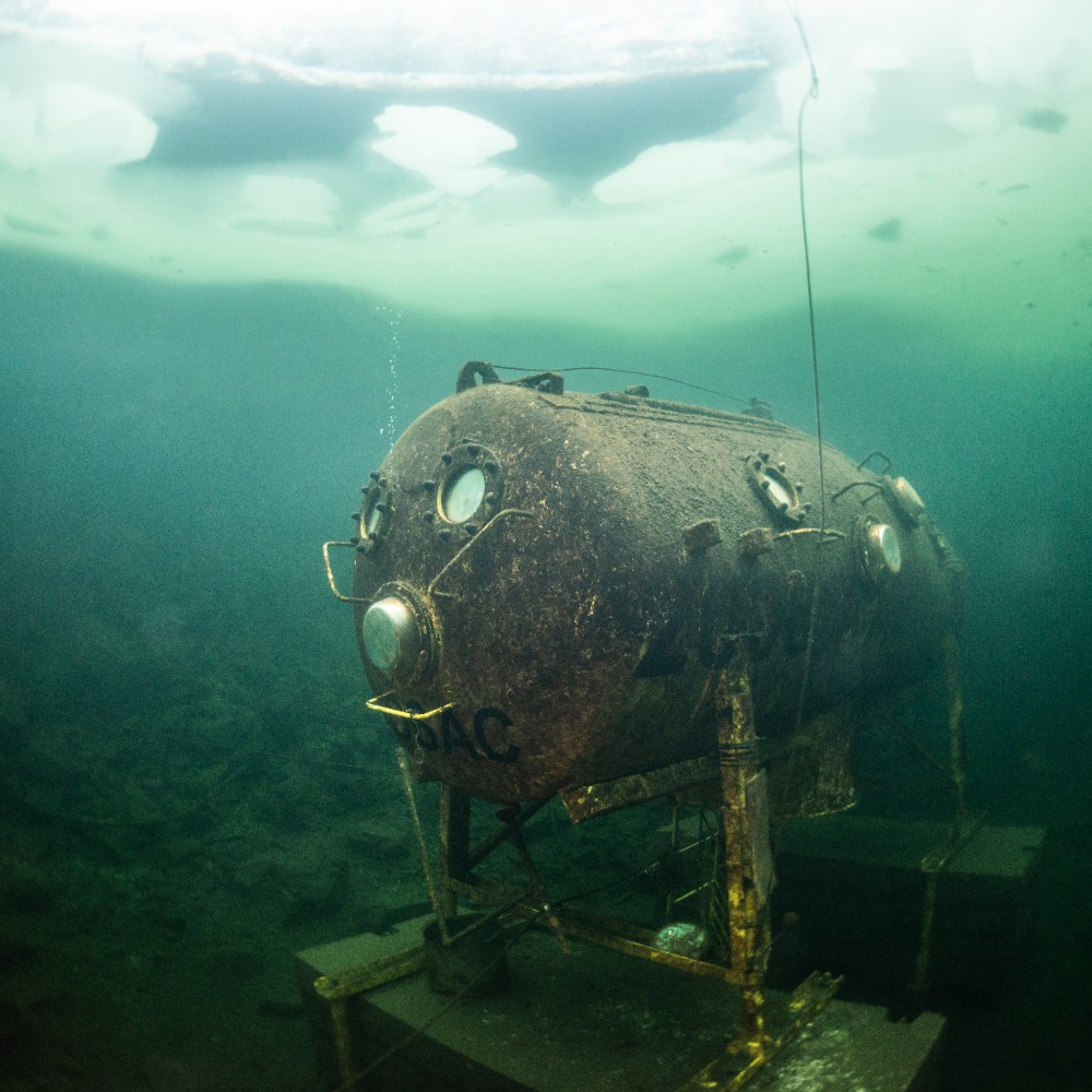 Nad kabinou je kus volného prostoru bez ledu, což zvyšuje bezpečnost ponoru. Bylo to fajn.